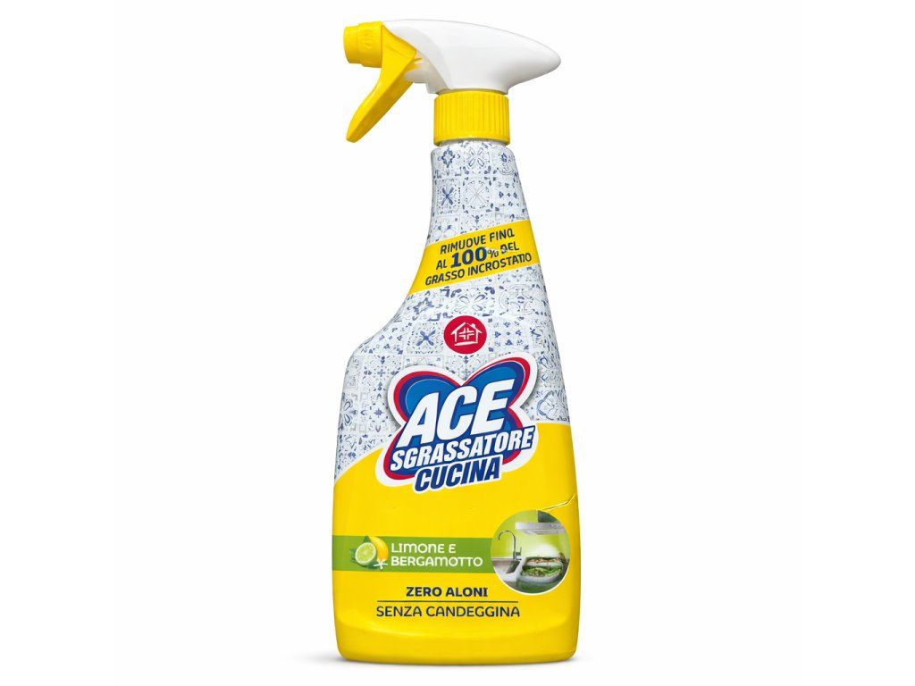 ACE Sgrassatore Cucina je účinný odmašťovač speciálně vyvinutý pro čištění kuchyňských povrchů. Díky silné čisticí formulaci dokáže odstranit až 100 % usazené mastnoty a připálených nečistot.