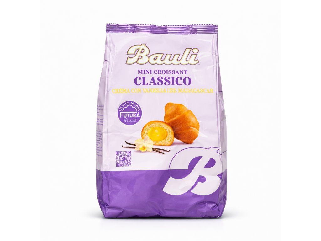 Bauli Mini Croissant Classico je nadýchané italské pečivo s jemnou náplní z vanilkového krému, připravené podle tradiční receptury značky Bauli. Díky měkkému těstu a jemné sladké chuti je ideální jako rychlá snídaně, svačina nebo sladké potěšení během dne.