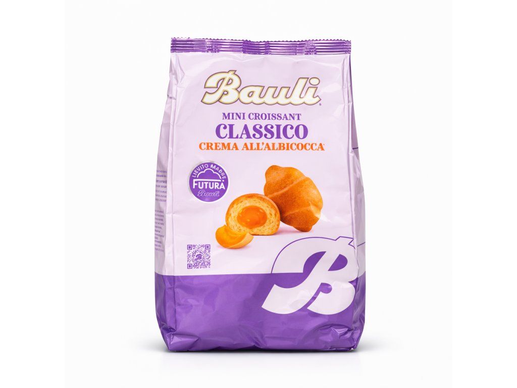 Bauli Mini Croissant Classico Albicocca je měkké a nadýchané pečivo plněné jemným meruňkovým krémem. Připravený podle tradiční italské receptury nabízí vyváženou sladkou chuť a jemnou strukturu těsta, která je typická pro produkty značky Bauli.