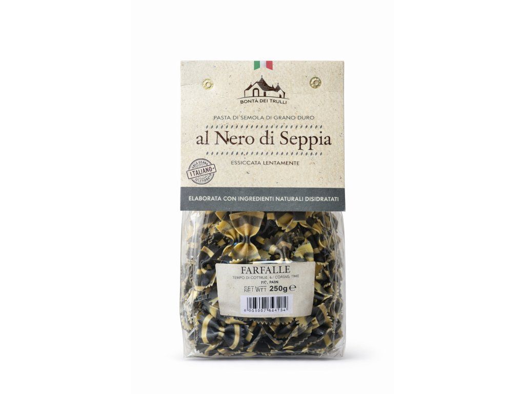 Farfalle al Nero di Seppia od Bontà dei Trulli jsou exkluzivní italské těstoviny z kvalitní semoliny z tvrdé pšenice, obohacené o inkoust ze sépie. Ten jim dodává nejen typickou tmavou barvu, ale i jemnou mořskou chuť.