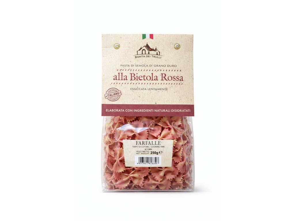 Farfalle alla Bietola Rossa od Bontà dei Trulli jsou kvalitní italské těstoviny z tvrdé pšenice, obohacené o červenou řepu, která jim dodává přirozenou barvu a lehce nasládlou chuť.