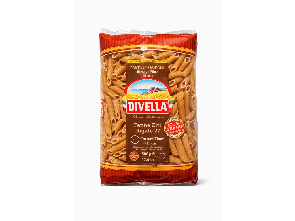 Divella Penne Ziti Rigate Integrale 27 jsou kvalitní celozrnné těstoviny s drážkovaným povrchem, který perfektně zachytí omáčku. Vyrábějí se z tvrdé pšenice pěstované v Itálii a díky celozrnnému zpracování mají vyšší nutriční hodnotu, přirozenou chuť a pevnou konzistenci.