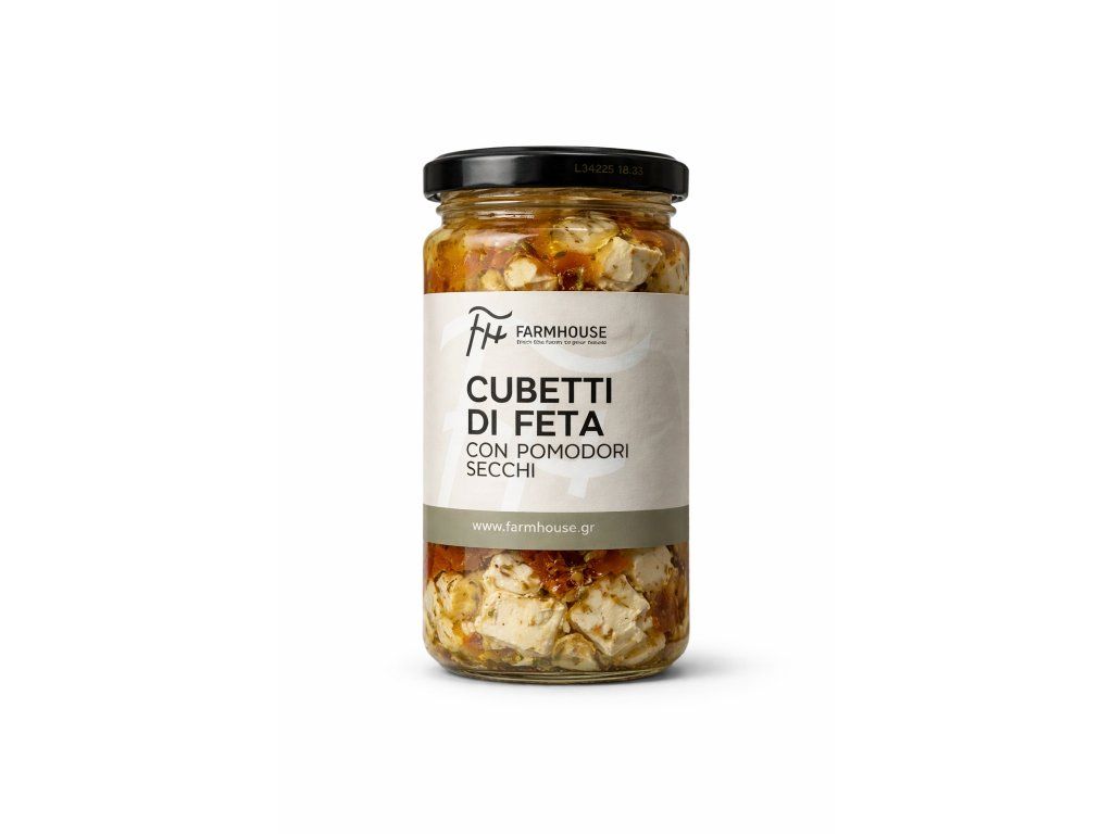 Farmhouse Cubetti di Feta con Pomodori Secchi představují lahodnou kombinaci jemného sýra feta a aromatických sušených rajčat, naložených v oleji s bylinkami.