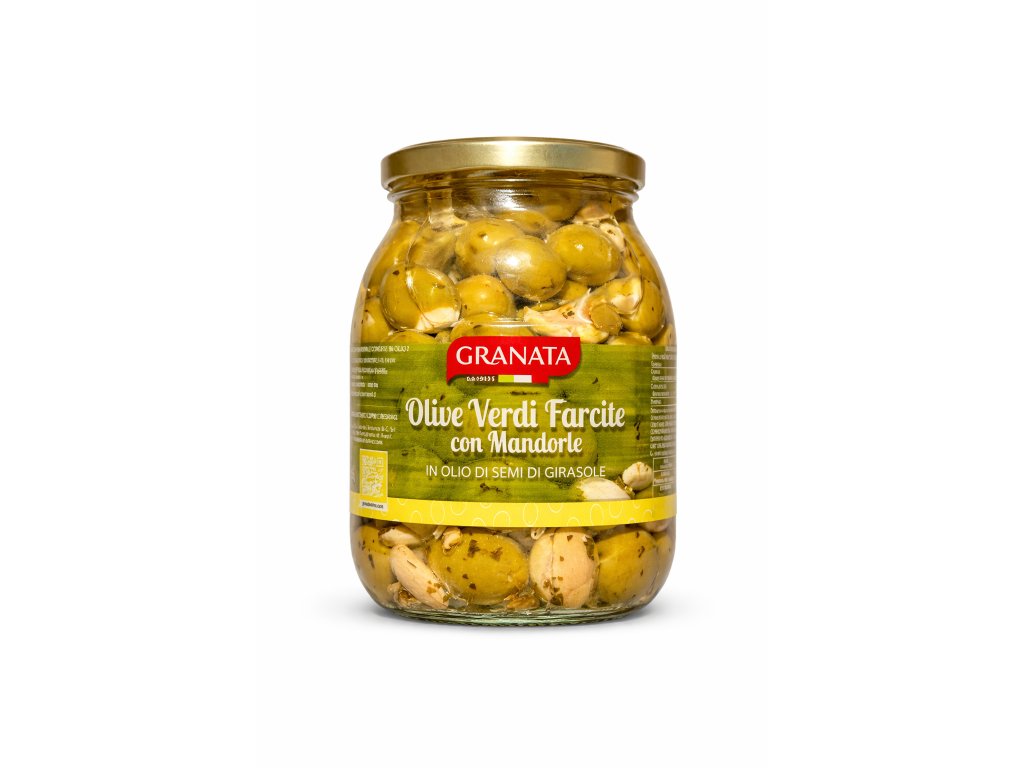 Granata Olive Verdi Farcite con Mandorle jsou prémiové zelené olivy, ručně plněné celými mandlemi a zalité olejem ze slunečnicových semínek. Tato kombinace vytváří jedinečnou delikatesu, která spojuje jemně slanou chuť oliv s výraznou, máslovou chutí mandlí.
