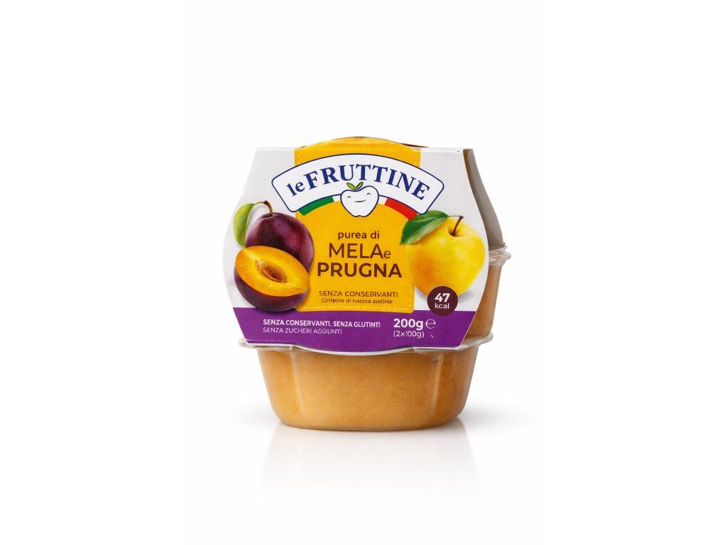 Le Fruttine jablko & švestka kombinuje jemnou sladkost jablek s výraznější chutí švestek. Výsledkem je dokonale vyvážené pyré, které chutná přirozeně a není přeslazené.