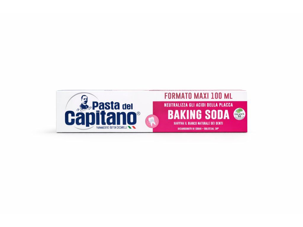 Pasta del Capitano Baking Soda je kvalitní italská zubní pasta obohacená o jedlou sodu, která pomáhá neutralizovat kyseliny vznikající v zubním plaku a zároveň podporuje přirozené bělení zubů.