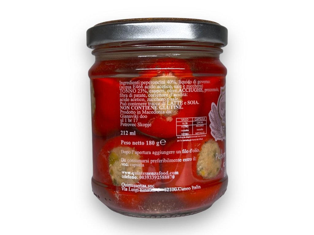 Quintessenza Peperoncini Farciti con Tonno, 180 g je italský produkt, který kombinuje pikantní papričky plněné jemným tuňákem. Tento výrobek je ideální jako předkrm, součást antipasti nebo jako doplněk k aperitivům.