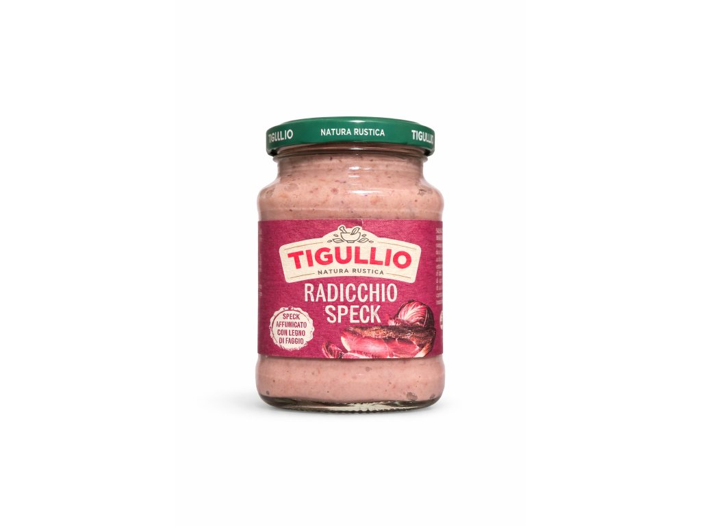 Tigullio Radicchio e Speck je tradiční italská omáčka s výrazným charakterem. Kombinuje jemnou hořkost červeného radicchia a uzený tón alpského specku, který je vyuzený na bukovém dřevě. Výsledkem je intenzivní a aromatická omáčka, která dokonale sedí k těstovinám, ale vynikne také v rizotu nebo se smetanovými gnocchi.
