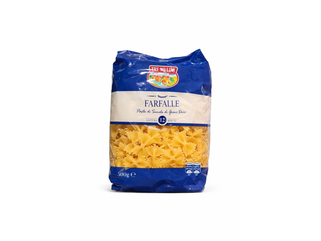 Tre Mulini Farfalle jsou tradiční italské těstoviny ve tvaru mašliček, vyrobené z kvalitní semolinové mouky z tvrdé pšenice. Díky svému specifickému tvaru krásně drží omáčku a zároveň poskytují zajímavou strukturu při každém soustu.