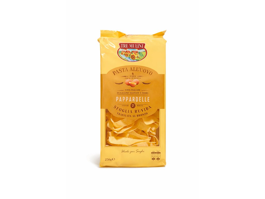Tre Mulini Pappardelle jsou tradiční italské vaječné těstoviny vyrobené z kvalitní pšeničné krupice a čerstvých vajec. Díky bronzovému tažení (trafilata al bronzo) mají typicky drsnější povrch, na kterém dokonale ulpívají hutné omáčky.